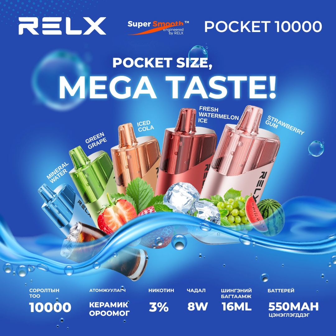悦刻大板砖 RELX Pocket 10000一次性电子烟设计兼顾大容量与便携性,日常放进口袋或随身包里都很轻松,设备内部预装16ml烟油,最高可抽10000口,采用陶瓷雾化芯,烟雾细腻度更高,味道还原度好,8W功率让烟雾量保持在比较舒服的范围。内部配备550毫安可充电电池,再加上Type-C充电设计,设备可以完整使用完烟油,不会出现提前报废的情况。
