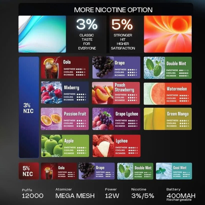 这款产品官方标注最高可抽 12000口,在同体积的一次性电子烟中,属于口数与体积平衡做得比较到位的一类。